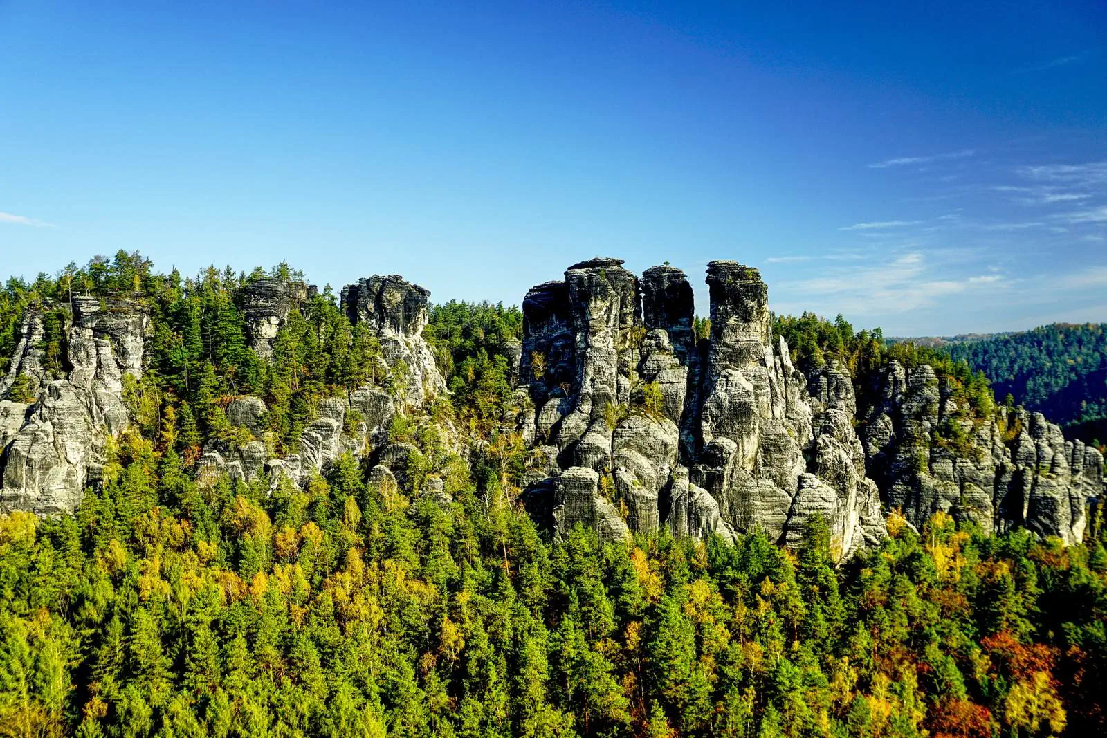 Ein Weitwinkelobjektiv ist entscheidend, um die imposanten Felsen und die Weite der Landschaft der Bastei einzufangen.